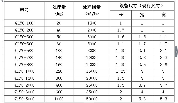 河北廣綠環(huán)保研發(fā)的優(yōu)異的活性炭和合適的活性炭使用量造就了活性炭設(shè)備優(yōu)異的工作能力,具體處理能力和設(shè)備參數(shù)如下: